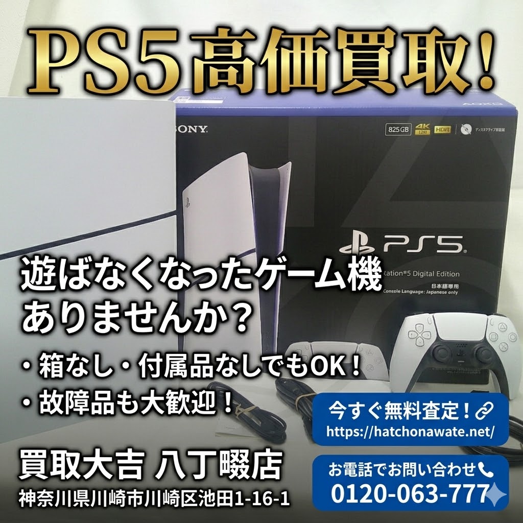 本日ご紹介させていただくお買取り品は、ソニーの大人気ゲーム機**「PlayStation 5(PS5)デジタル・エディション」**です。 一時期の極端な品薄状態もようやく落ち着きを見せていますが、それでもなお中古市場での需要は非常に高く、今回は箱や付属品も揃った綺麗な状態でお持ち込みいただきました。大切に保管されていたお品物をお譲りいただき、誠にありがとうございます。